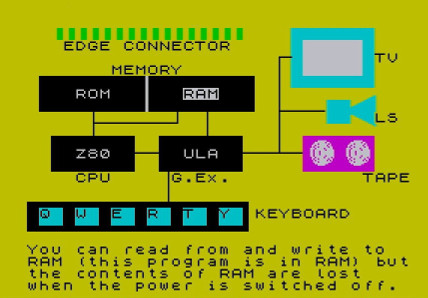 The Spectrum came in a black carton box, on which the computer with its rubber-keys was depicted and the words "Personal Computer" were confidentially written. Inside was the computer, the power supply, the cables to connect to television and tape recorder, a shorter manual, an informative book about BASIC programmming and a tape cassette with demonstration-programs called "Horizons". One of the programs on this tape introduced you to the hardware of the Spectrum (like briefly described above):